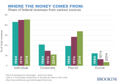 This year, about 46% of all revenues come from the individual income tax, 34% from the Social Security/Medicare payroll tax…
