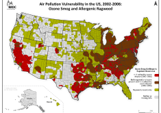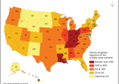 This map shows variations in the median resident's exposure to air pollution from industrial facilities. States with the darkest shade…