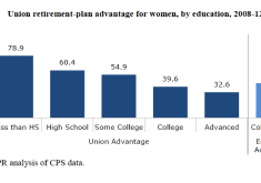 The union advantage for women is largest when looking at employer-provided retirement plans. Women in or represented by unions are…