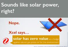 This infographic describes how monopoly utility Xcel Energy has two different messages on low-carbon energy, depending on the audience. Do…