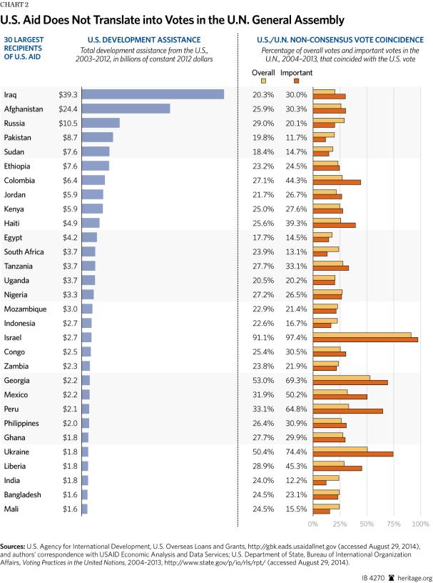 Of the 30 largest recipients of U.S. aid worldwide, only three voted for than half the time with the U.S. on overall votes in the U.N. General Assembly.