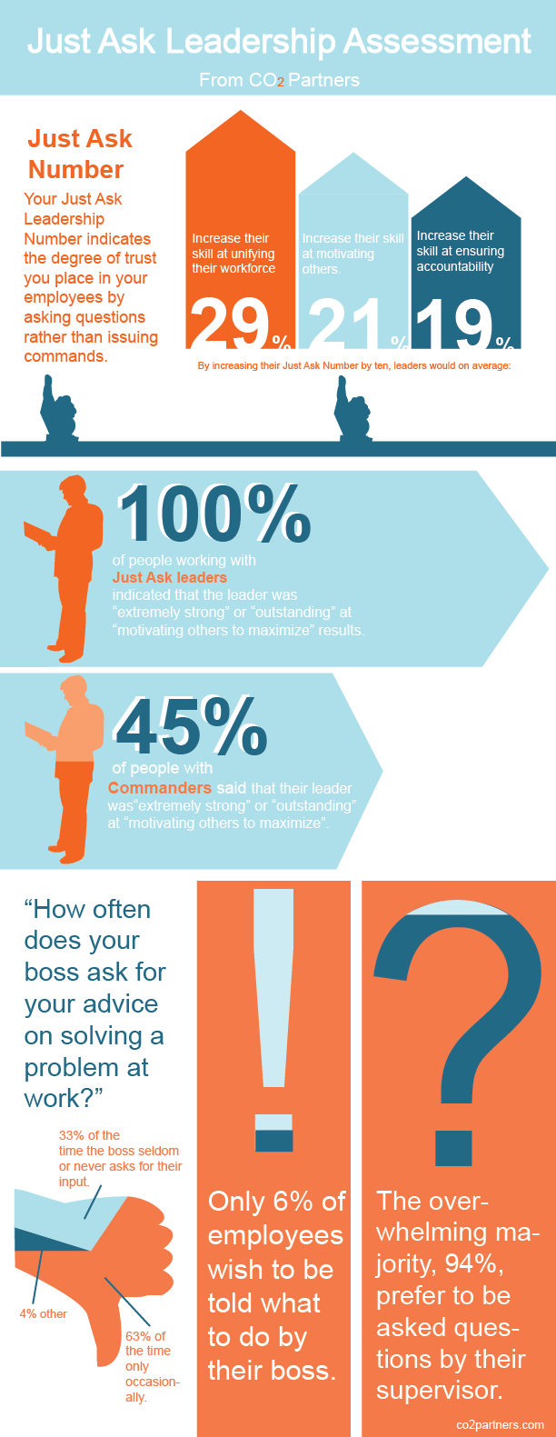 In working with leaders, I've found asking questions is a sorely undervalued technique. Many equate asking questions with losing power or admitting defeat. For years, command-and-control leadership dictated that a subordinate should be told, not asked. In recent years, though, command-and-control leadership has lost favor–primarily because it doesn’t work