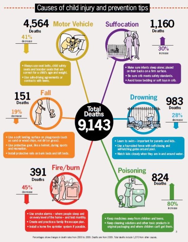The leading cause of injury death among American children was motor vehicle related deaths (4,564 deaths). Poisoning deaths showed a large increase from 2000 to 2009 with an 80% increase in child deaths.