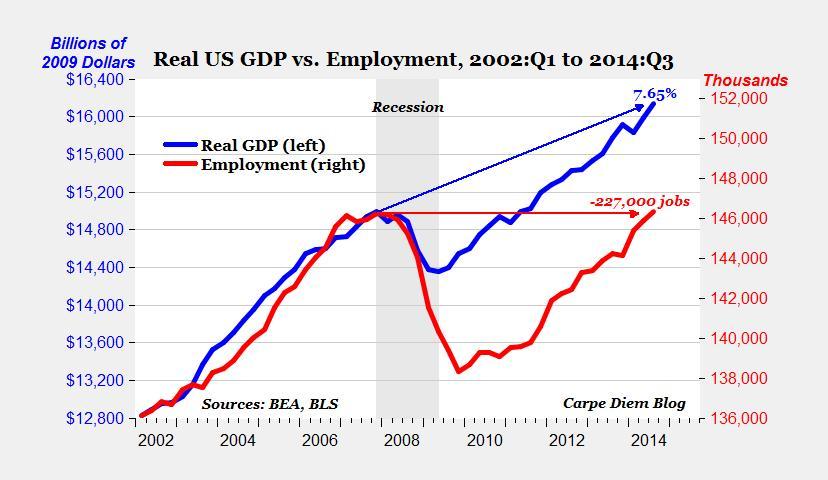 America’s got record-high GDP output but with 227,000 fewer workers. The fact that we have been able to greatly expand national output with fewer inputs (workers) represents a huge increase in economic efficiency, but has also left us with a lingering “jobless recovery” and an economy that is struggling to create new, post-recession employment opportunities for millions of Americans.
