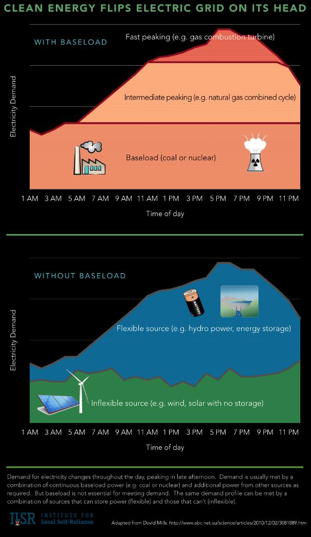 In a grid centered on distributed renewable energy resources, the best energy supply is one that is flexible (can rapidly change output to match grid demands). As a “baseload” resource, nuclear is the least flexible electricity supply, with nuclear power plants requiring very stable output around the clock.