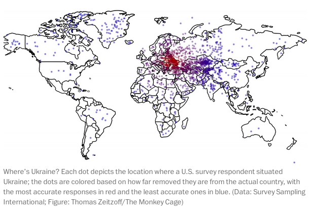 On March 2014, 3 political scientists asked a national sample of 2,066 Americans what action they wanted the U.S. to take in Ukraine. They also asked the survey respondents to locate Ukraine on a map. They found that the less accurate the participants were, the more they wanted the U.S. to use force.