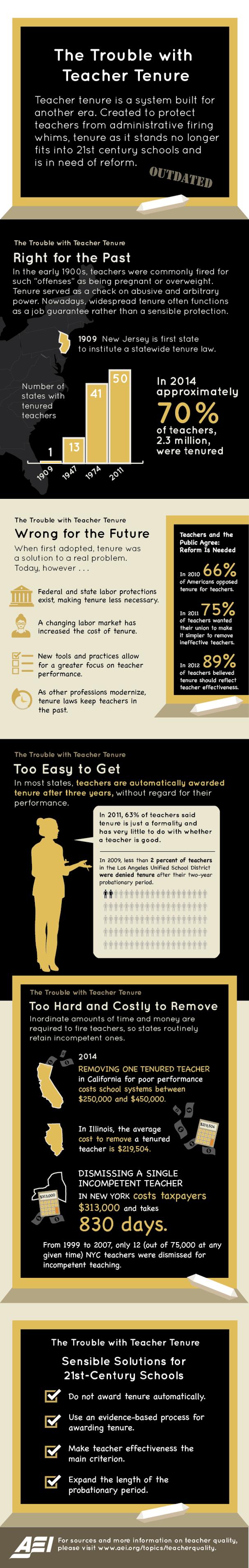 Teacher tenure is a system built for another era. Created to protect teachers from administrative firing whims, it's now automatically awarded in most states after three years. Schools now must spend large amounts of time and money to fire incompetent teachers. That's no way to treat our kids.