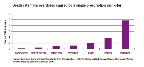 Methadone has the highest death rate among prescription painkillers, causing over 9 deaths per 100 kilograms of Methadone.