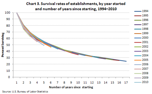 Less than 60% of new business establishments survive past 5 years. After 17 years, only 24.6% of new business establishments survived since their starts in 1994.