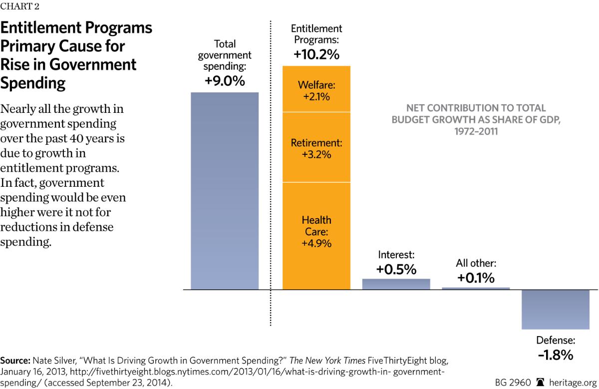 Nearly all the growth in government spending over the past 40 years is due to growth in entitlement programs. In fact, government spending would be even higher were it not for reductions in defense spending.