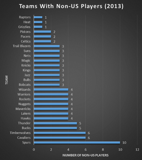 In 2013 which team in the NBA had the most foreigners on their roster?