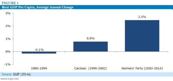 GDP per person (adjusted for inflation) in Brazil grew at a rate of 2.5 percent annually from 2003-2014, more than three times faster than the 0.8 percent annual growth of the prior government (1995-2002). This growth rate was achieved in spite of the 2008-09 global financial crisis, which pushed Brazil into recession in 2009; and this comparison includes the slowdown of the past few years as well.