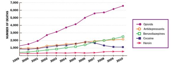 Over the last decade, prescription painkiller overdose deaths have increased dramatically among women. Opioid overdose deaths have increased more than any other type of drug, climbing from 1,287 deaths in 1999 to 6,631 deaths in 2010.