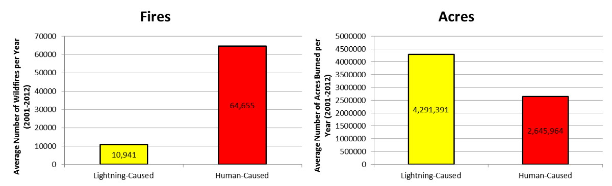 On average, there were more human-caused wildfires (64,655) per year than lightning-caused wildfires (10,941) in the U.S. from 2001-2012. However, on average there were more acres burned by lightning-caused wildfires (4,291,391) than by human-caused wildfires (2,645,964).