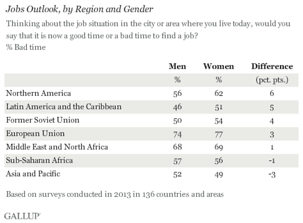 In Northern America, women are more negative than men when it comes to job outlook, trailing behind the Middeast & North Africa which only has a 1pt. difference between genders. Considering that the West champions itself in terms of equality, why do you think this disparity is so?