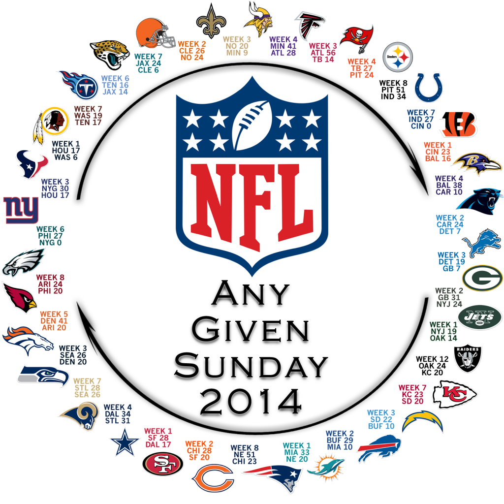 Finally the Oakland Raiders (as of week 12) won their first game of the year this week against Kansas City. This means that the NFL "Circle of Parity" is now complete! Basically this chart shows that every team in the league has beaten another team, who has also beaten another team, who has also defeated a different team, that beat another team... and so on and so forth.