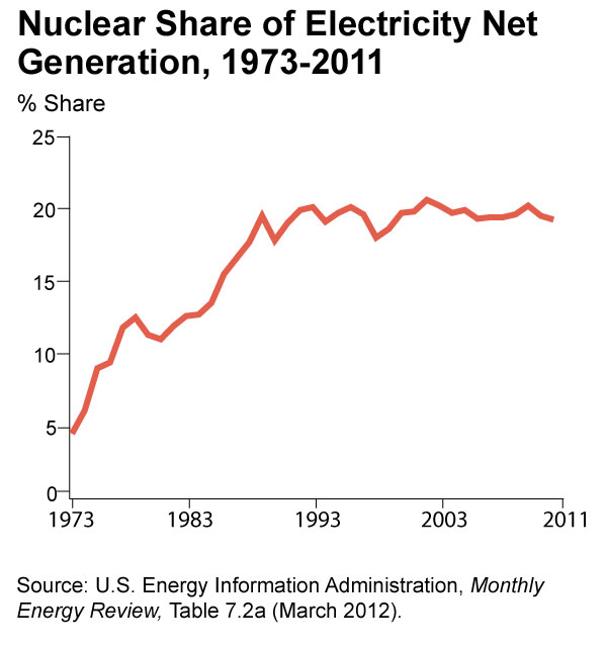 Nuclear power generated a little more than 19% of the electricity consumed in the United States in 2011. The share of electricity generated by nuclear power in the US has been growing substantially since 1973.