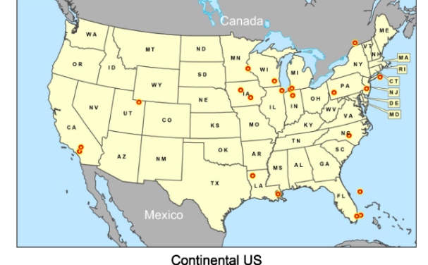 This graphic shows the locations of part 121 US civil aviation accidents in the continental US for 2010. Most accidents seem to be concentrated in the eastern half of the United States.