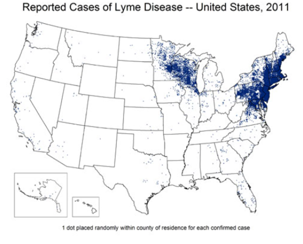 In 2011, individuals who reported Lyme disease cases resided mostly in the North Eastern and Mid-Western regions of the United States. Although this does not necessarily mean they were infected in these areas, the magnitude of reported cases is reason to keep proper safety in mind no matter which state you are in.