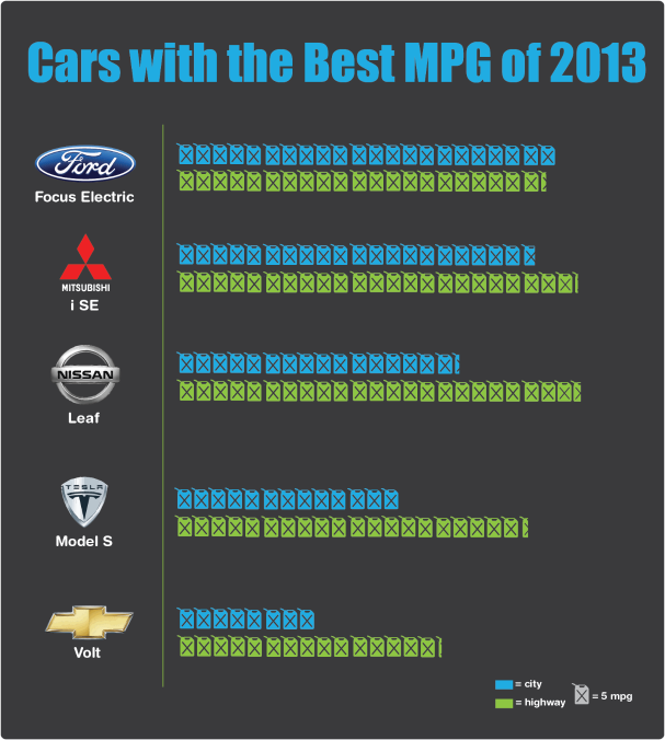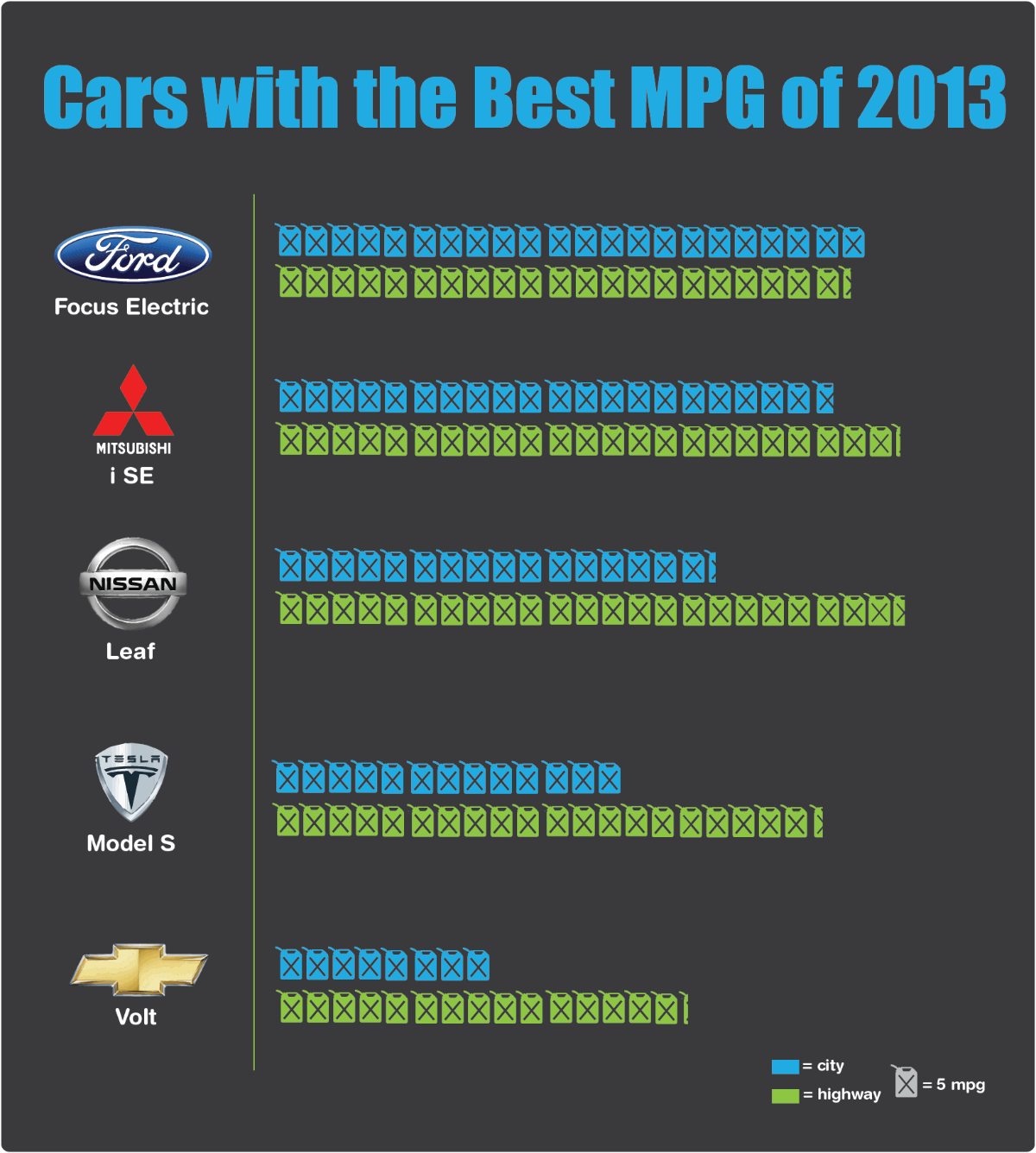 The 5 vehicles with the highest rated Miles-per-Gallon of 2013.