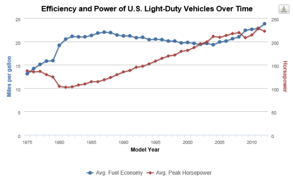 Average fuel economy of U.S. light-duty vehicles has increased over 80%, from 13.1 mpg in 1975 to 23.8 mpg in 2012. However, for a time, horsepower took precedent over fuel efficiency, as average fuel economy decreased from 22 mpg in 1987 to 19.3 mpg in 2004, while average horsepower increased from 118 to 211 (see source about trucks).