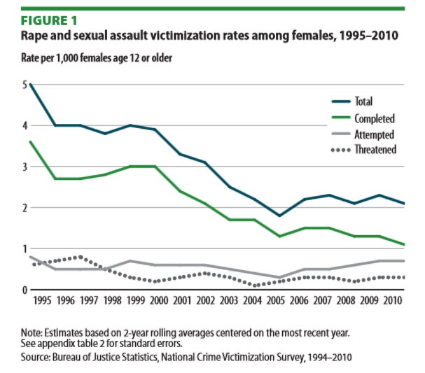 Sexual violence includes either completed, attempted, or threatened rape or sexual assault. These rates are declining for women aged 12 and older in the US. In 1995, women reported 556,000 cases of sexual violence. This decreased to 270,000 in 2010. However, completed rape or sexual assault made up more than 50% of the total rape or sexual assaults in 2010.