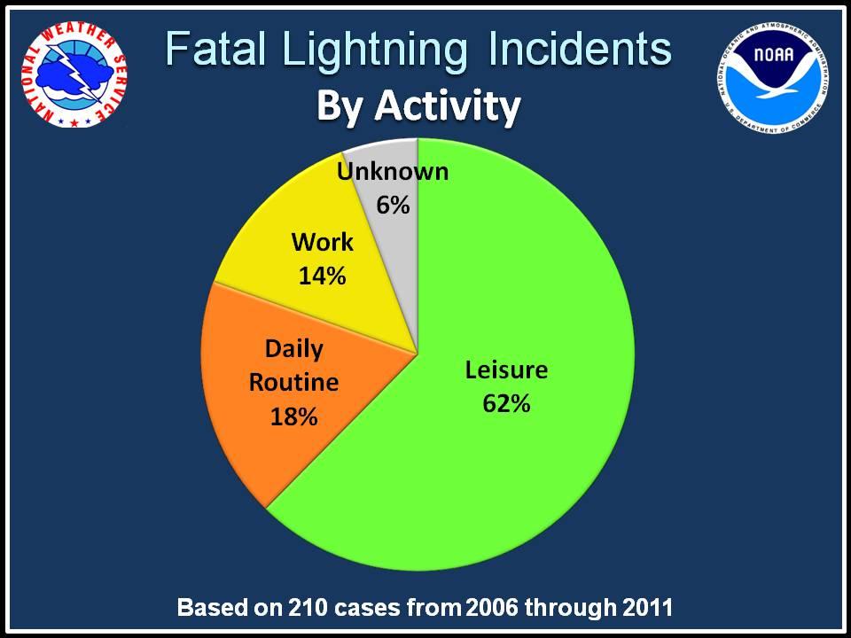 Of the 210 reported fatal lightning incidents in the U.S. from 2006 to 2011, 62% of the victims were struck while participating in a leisure activity. 18% of the victims were involved in a daily routine while 14% were killed while working. Talk about a bad day at work.