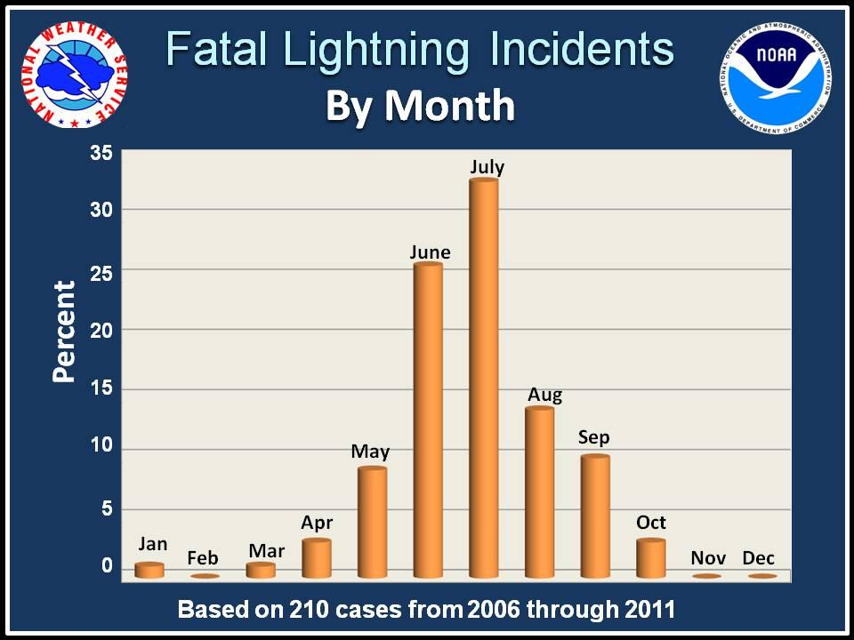 Of the 210 reported fatal lightning incidents in the U.S. from 2006 to 2011, over 30% occurred in July, making July the most dangerous month for fatal lightning strikes.
