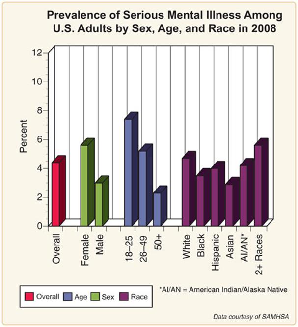 In 2008, about 5% of U.S. adults had a serious mental illness (SMI). Women were much more likely to have had a diagnosable SMI than men and young adults (ages 18-25) were more likely to be diagnosed than older Americans (age 50+).