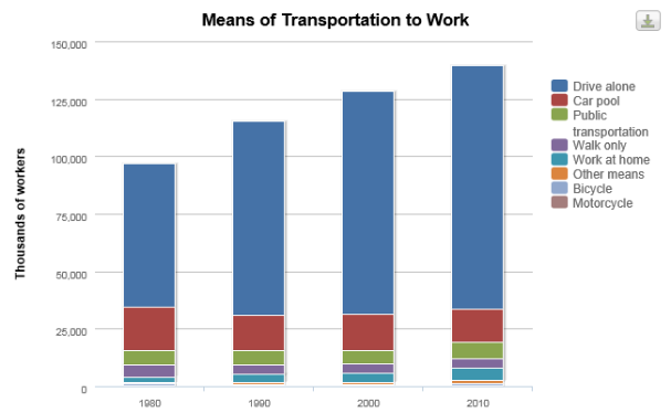 The number of people carpooling to work has decreased from 19.1 million people in 1980 to just 14.4 million in 2010. More Americans are now driving alone to work, with 43 million more people driving alone in 2010 (105.8 million) than in 1980 (62.2 million). Working at home has also become more popular, while walking to work has lessened.