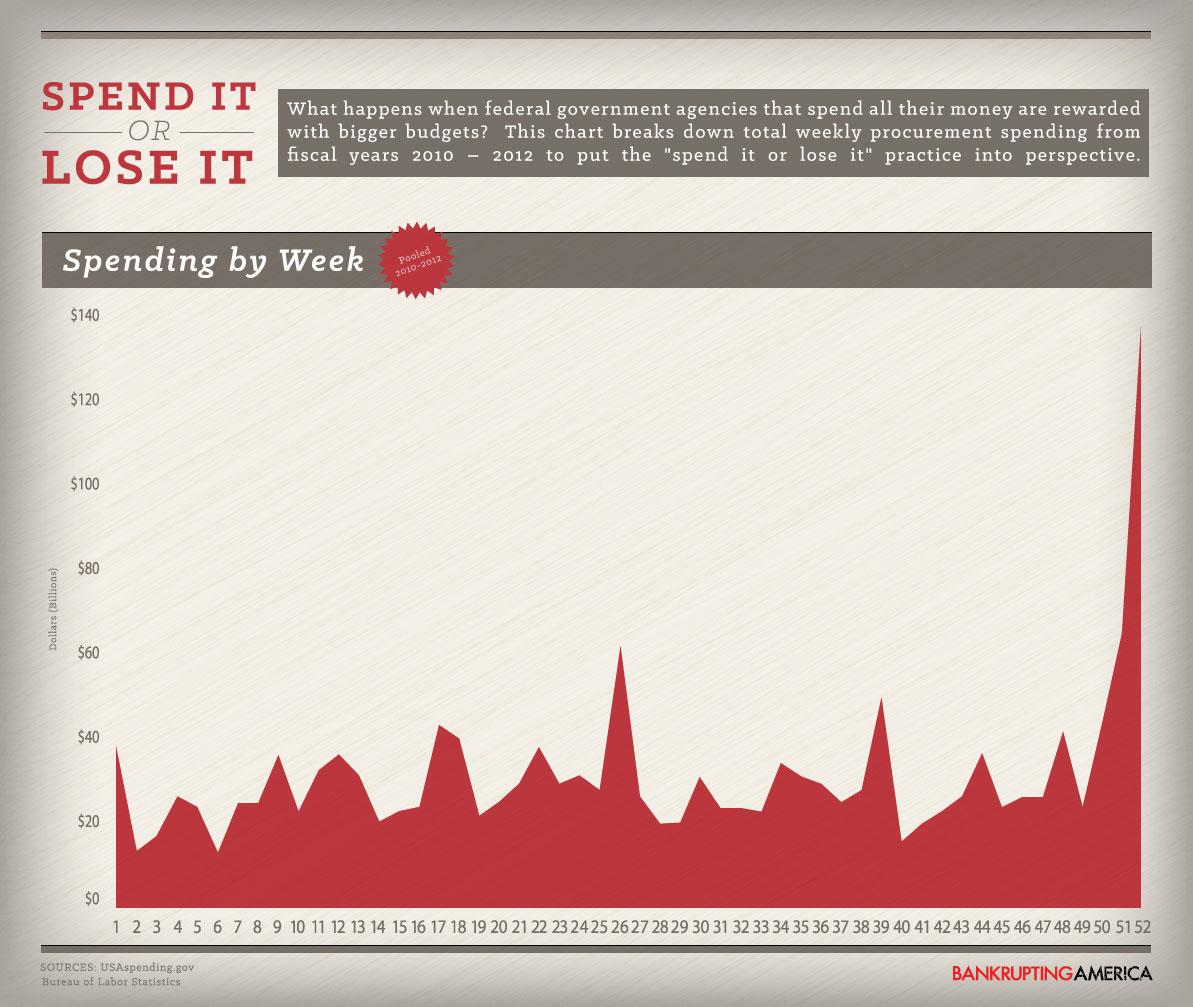 What happens when federal government agencies that spend all their money are rewarded with bigger budgets? This chart breaks down total weekly procurement spending from fiscal years 2010-2012 to put the "spend it or lose it" practice into perspective.