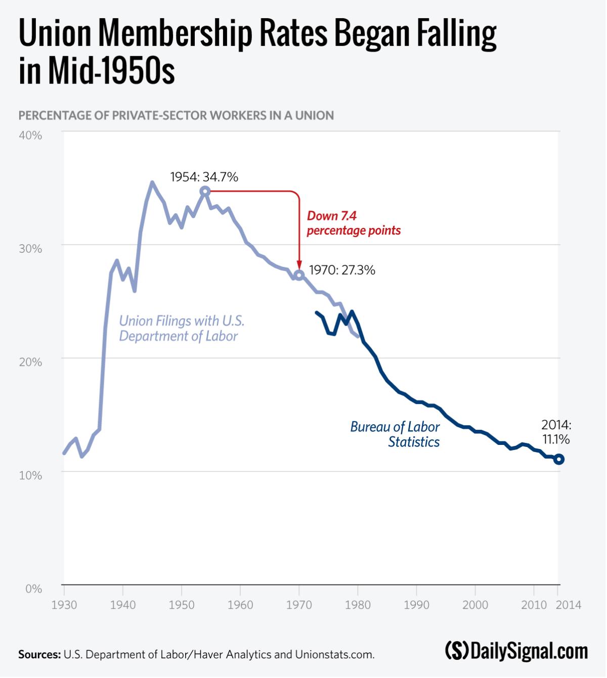 Private-sector union membership has been declining for decades. According to James Sherk, a senior policy analyst in labor economics at The Heritage Foundation, “Union membership has declined because many workers see little value from union representation."