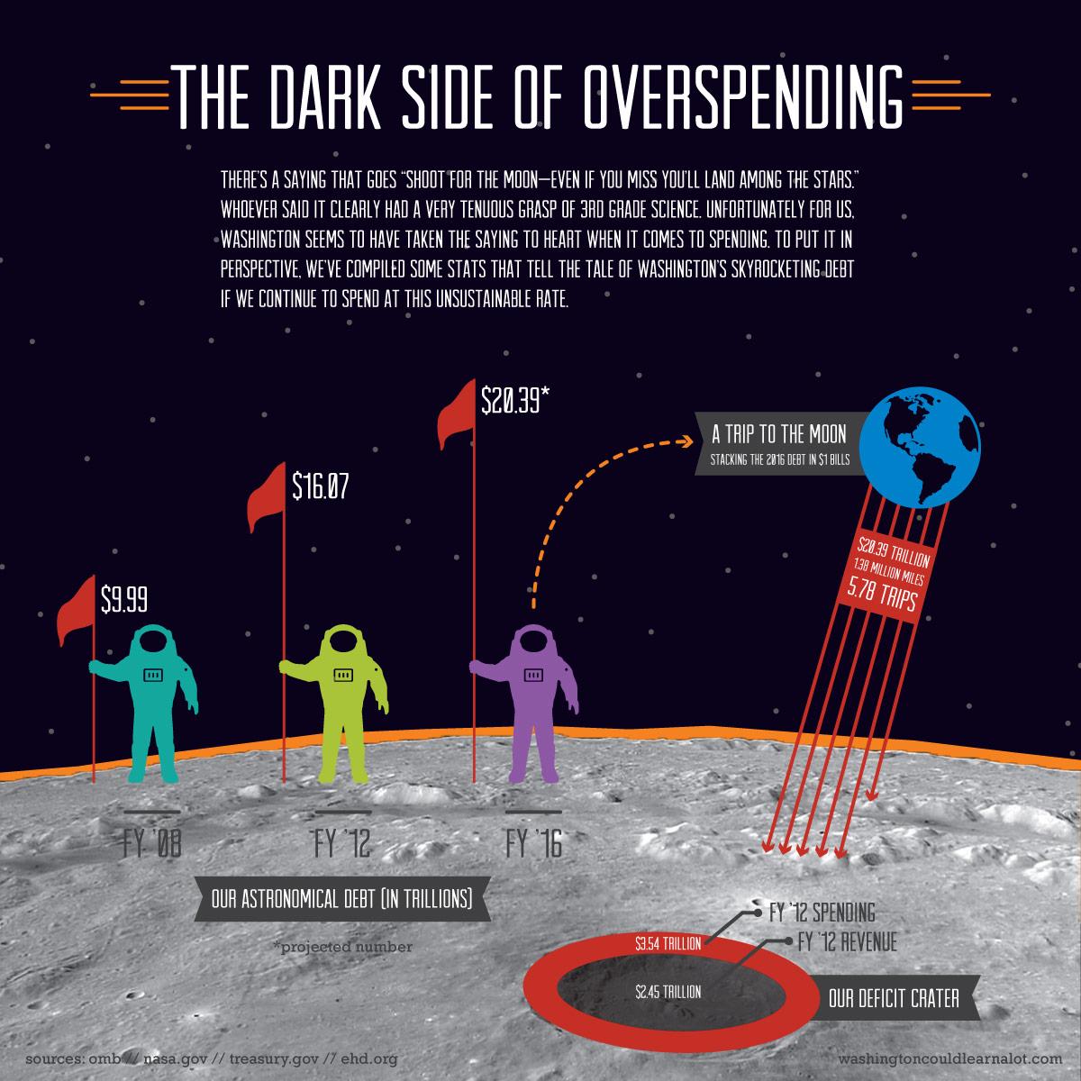 There’s a saying that goes, “shoot for the moon – even if you miss, you’ll land among the stars.” Unfortunately for us, Washington seems to have taken the saying to heart when it comes to spending. To put it in perspective, we’ve compiled some stats that tell the tale of Washington’s skyrocketing debt.