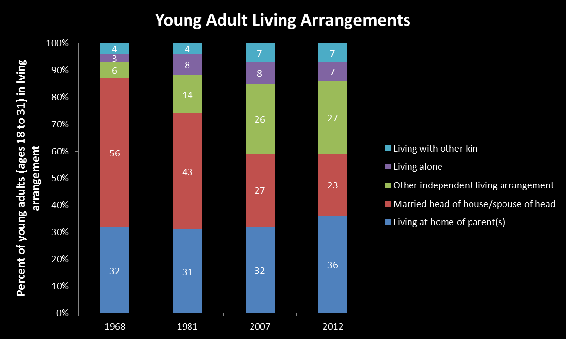 Parents may soon be wishing that they were empty nesters. 36% of young Americans (ages 18 to 31) were living with the parents in 2012, compared to only 32% in 2007. Even more significant is the drop in the percentage of young married couples living together under their own roofs, falling from 52% in 1968 to just 23% in 2012.