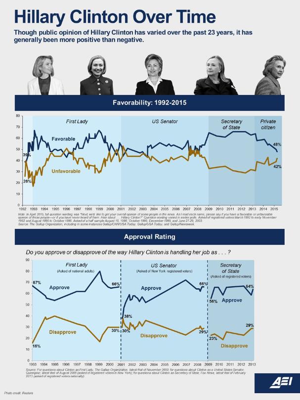 Public opinion of Hillary Clinton has varied over the past 23 years, but has been generally more positive than negative.