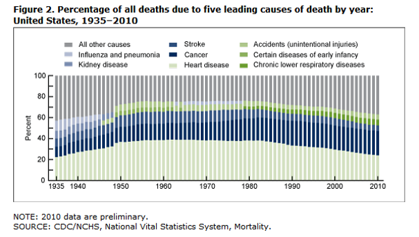 Since 1935, heart disease and cancer have remained the first and second leading causes of death, respectively in America. Stroke has also remained among the top five causes of death during this time span.
