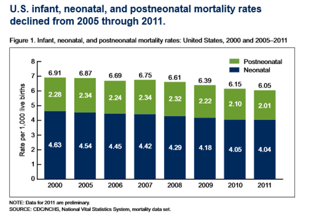 From 2005 to 2011, neonatal and postneonatal mortality rates declined in the United States. This means that death during the first four weeks of life and the weeks following was less likely to occur in 2011.