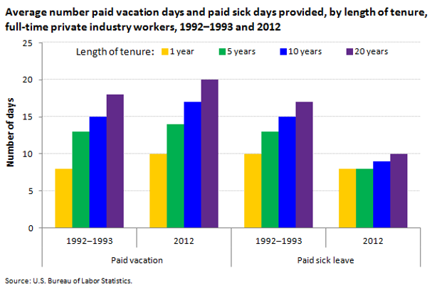 The average number of paid vacation days for full-time private industry workers increased among all tenure lengths from 1992-93 to 2012. However, paid sick leave decreased among all tenure lengths. In 2012, an average employee working at the same company for 20 years earned 10 paid sick days, the same number of days given to a one-year employee in 1992-93.