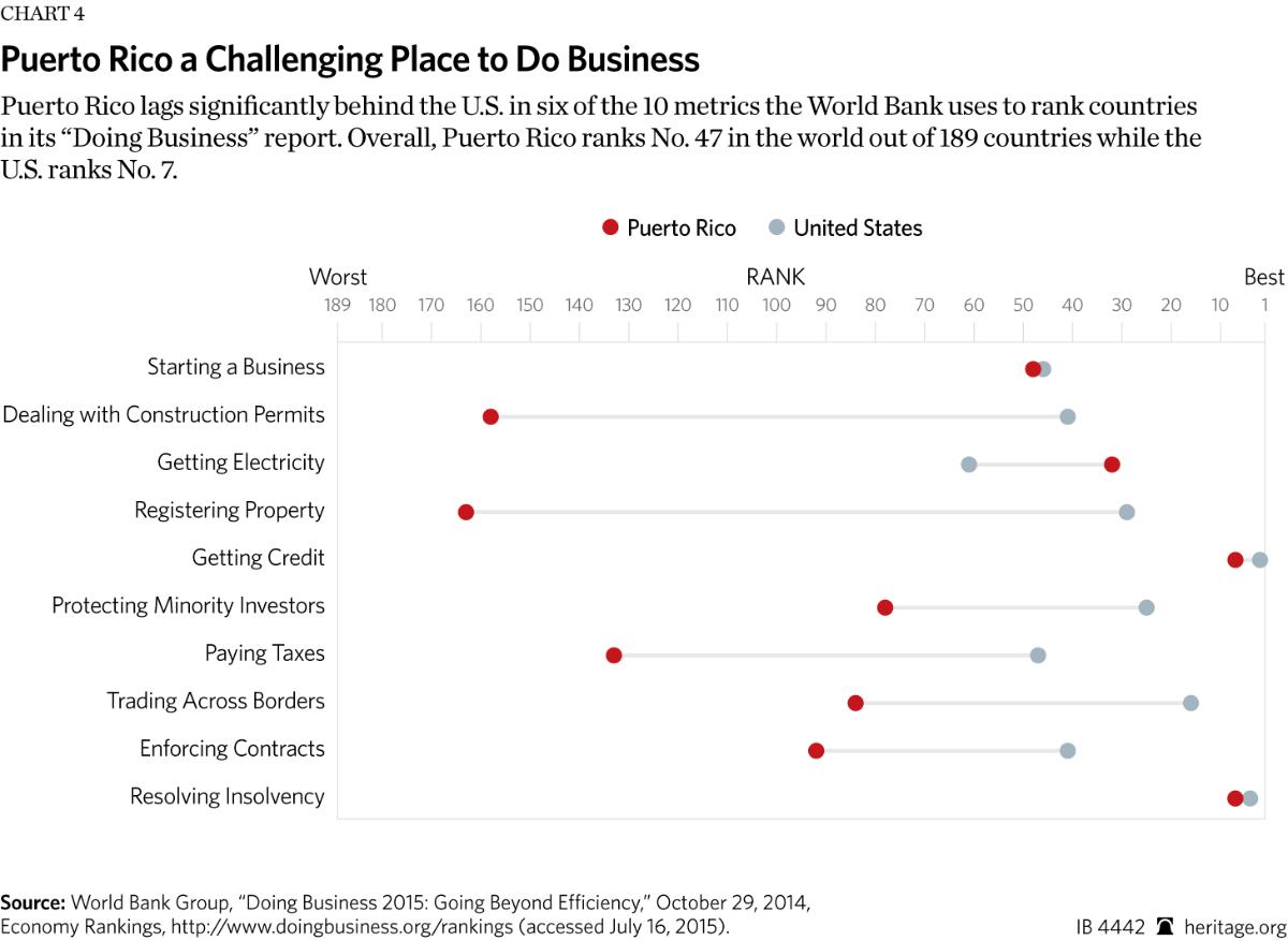 Puerto Rico lags significantly behind the U.S. in six of the 10 metrics the World Bank uses to rank countries in its “Doing Business” report. Overall, Puerto Rico ranks No. 47 in the world out of 189 countries while the U.S. ranks No. 7.