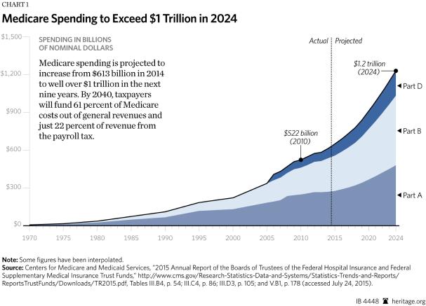 Medicare spending is projected to increase from $613 billion in 2014 to well over $1 trillion in the next nine years. By 2040, taxpayers will fund 61 percent of Medicare costs out of general revenues and just 22 percent of revenue from the payroll tax.