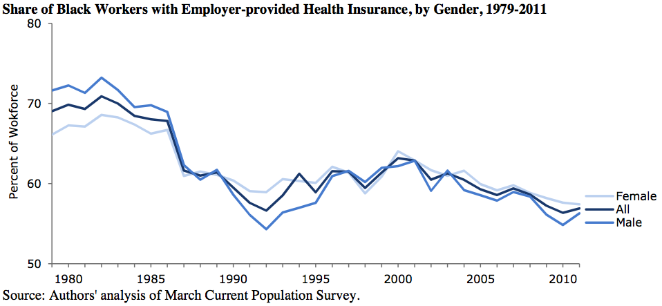 In the past 30 years the share of all black workers with employer-provided health insurance declined, from 69.0 percent to 56.9 percent.