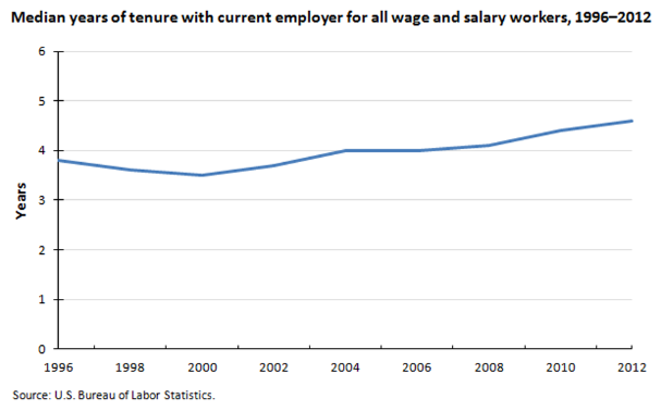 From 2000 to 2012, the median U.S. employee tenure increased from 3.5 years of tenure to 4.6 years. This rise is partly due to an increase in the median age of employed persons, increasing from 39.4 years in 2000 to 42.3 years in 2012.