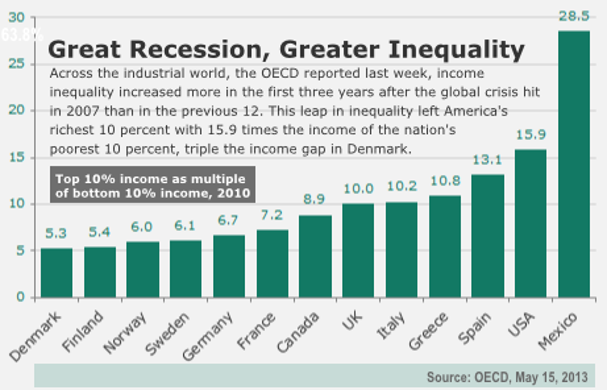 Back in 1996, the developed world's top 10 percent took home 8.9 times the income of the bottom 10 percent. That gap in 2010: 9.8 times. Over those same years, the Organization for Economic Cooperation and Development reports, the U.S. gap between top and bottom 10 percent rose from 12.5 to 15.9 times.