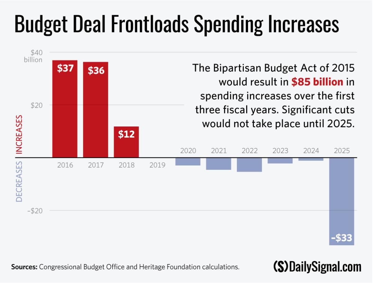 The Bipartisan Budget Act of 2015 would result in $85 billion in spending increases over the first three fiscal years. Significant cuts would not take place until 2025.