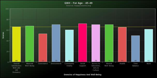 These are the Gross National Happiness Index scores for people age 45-49 These results are from over 25,500 people who took the survey between March 2011 and September 2013.