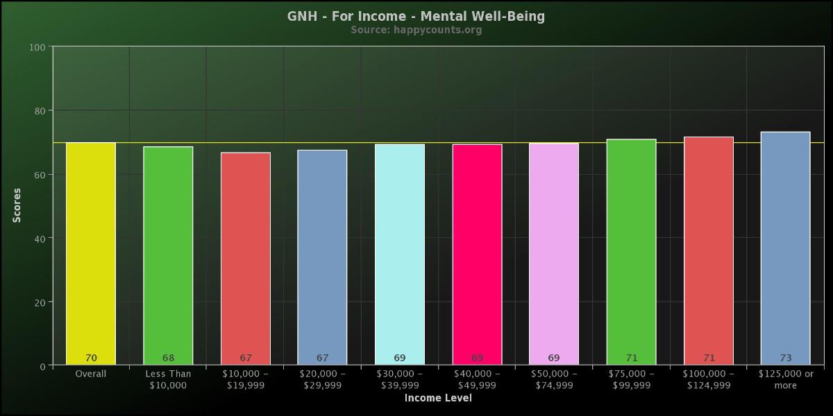 The Gross National Happiness score for the domain of mental wellbeing- are you engaged, optimistic, feel a sense of purpose and accomplishment - are relatively similar for all levels of income. These results are from over 25,500 people who took the survey between March 2011 and September 2013.