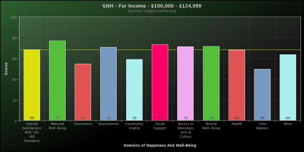 These are the Gross National Happiness Index scores for people with income between 100-124,999K. These results are from over 25,500 people who took the survey between March 2011 and September 2013.