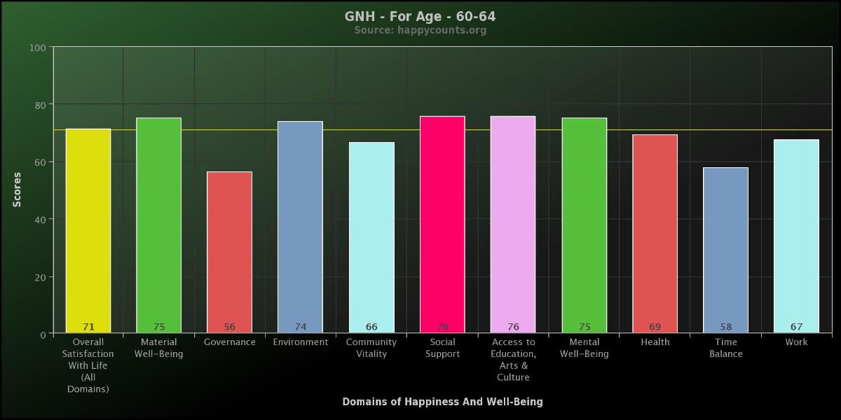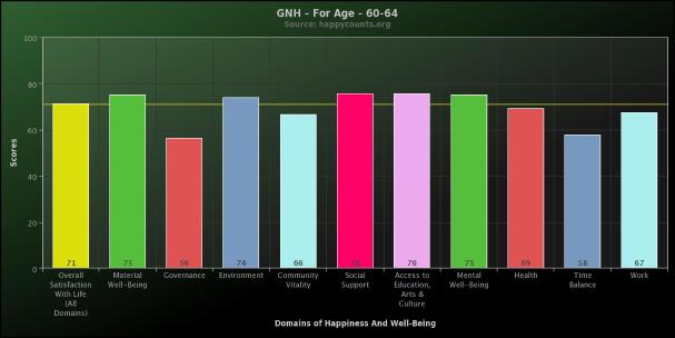 These are the Gross National Happiness Index scores for people age 60-64 These results are from over 25,500 people who took the survey between March 2011 and September 2013.