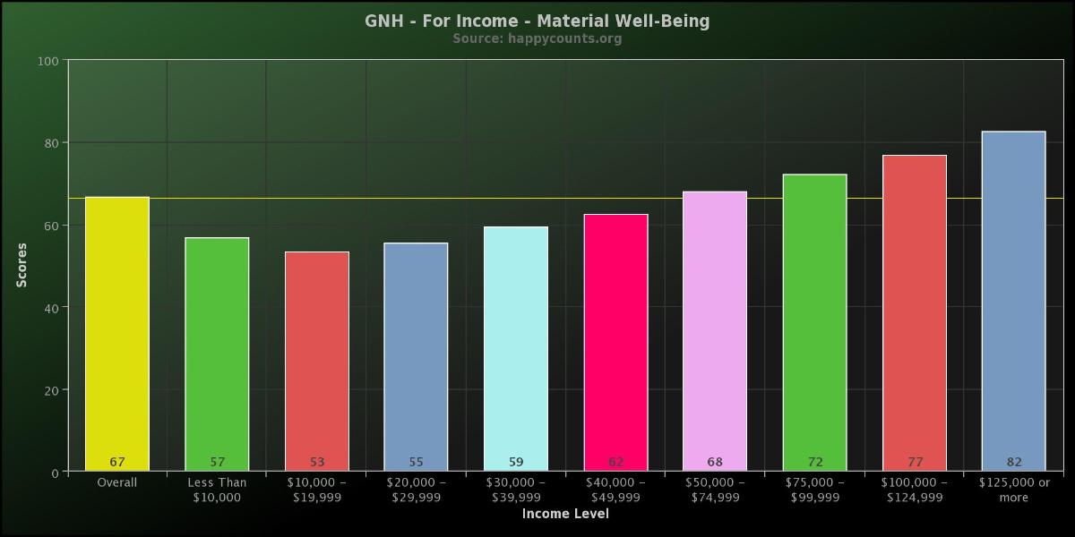 The Gross National Happiness score for the domain of material wellbeing indicates people earning less than 10K a year are slightly better off in terms of making ends meet than those in the next two higher earning levels. These results are from over 25,500 people who took the survey between March 2011 and September 2013.