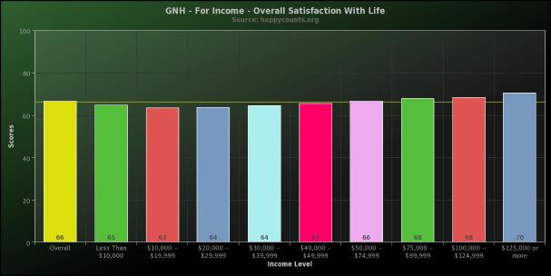 The Gross National Happiness score for the domain of overall satisfaction with life (SWL and affect) indicates earning levels don't make a big difference in whether you feel happy or sad and if you feel like your life is worth living. These results are from over 25,500 people who took the survey between March 2011 and September 2013.